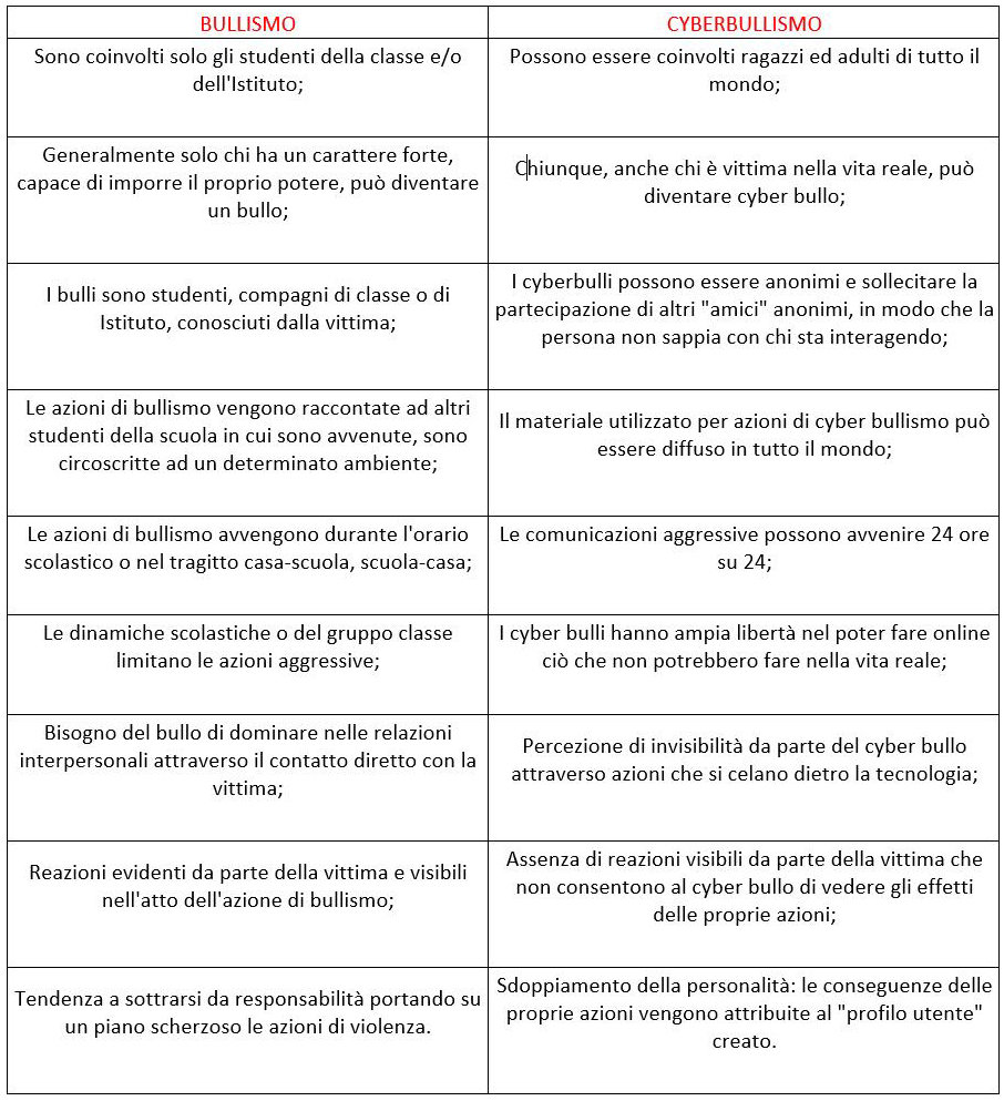 L’anonimato e la virulenza sono le principali differenze fra il cyberbullismo e il bullismo. Infatti, nei vari social si possono utilizzare nickname non inerenti al proprio nome o al luogo in cui si vive e questo rende il cyberbullo più subdolo, vigliacco e pericoloso.