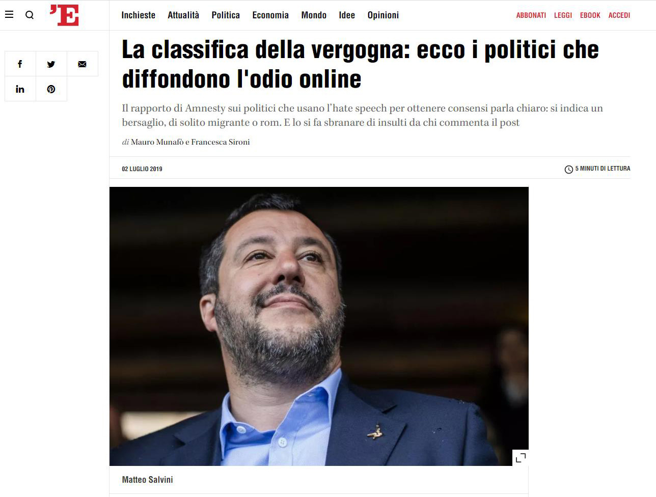 Durante le campagne elettorali Amnesty International ha inaugurato il barometro dell’odio, contro i politici italiani che hanno usato l’hate speech durante le elezioni dello scorso 26 maggio per ottenere consensi, puntando su bersagli quali migranti, musulmani e donne.