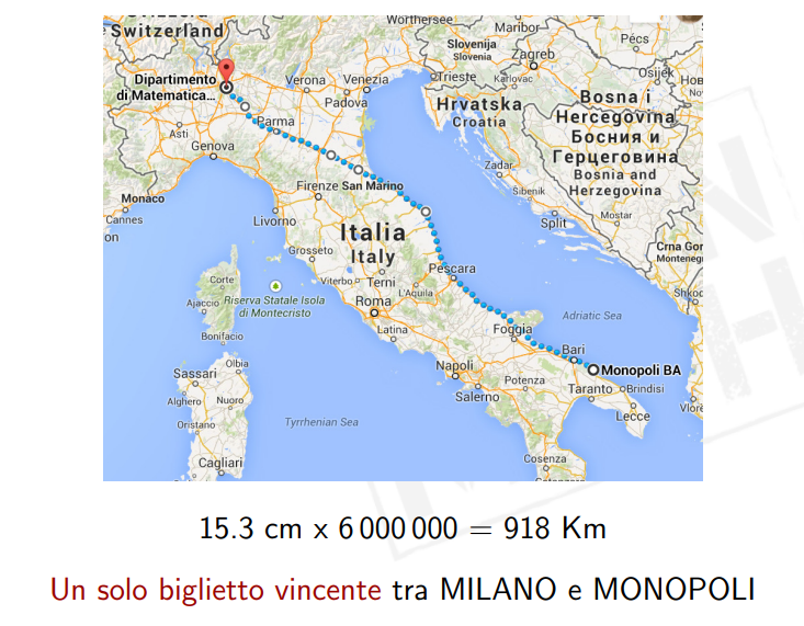 Un progetto del Politecnico di Milano contro le ludopatie dimostra che,se vogliamo comprare il “Gratta & Vinci” da mezzo milione di euro, abbiamo le stesse probabilità di trovarlo e sceglierlo percorrendo a piedi una fila ininterrotta di biglietti lunga 900 km, scegliendo quello giusto.